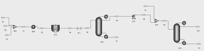 EDA裂解工段主要设备为反应器和精馏塔,各单元模块连接如图所示。EDA合成工段得到的EDA通过流股混合器混合加热后进入裂解反应器,经过裂解反应后的产物经过精馏塔二次分离,塔顶得到含量较高的醋酸乙烯酯产品。