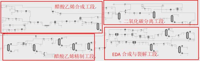 醋酸乙烯酯生产工艺流程分为醋酸乙烯合成、二氧化碳分离、醋酸乙烯精制及EDA合成与裂解四个工段。原料混合后经过加热器加热通入流化床反应器,反应产物冷却后进入气液分离器,汽相物流进入二氧化碳分离工段回收产品醋酸乙烯酯,液相物流混合后进入脱气塔,分离后汽相物料作为循环原料气体,液相物流去往醋酸乙烯酯精制工段。用甘油作为萃取剂萃取出混合物中的水,经过精制工段的萃取精馏塔分离后塔顶得到高纯度醋酸乙烯酯产品,塔底为水和甘油。醋酸甲酯混合加热进入到搅拌釜反应器与压缩后的一氧化碳、氢气混合发生动力学反应,反应后经过多级闪蒸,液相经泵作用输入至脱醋酸甲酯塔,塔底采出EDA等混合物,该物流通入脱EDA塔后,塔底采出高浓度EDA,经过加压加热后进入裂解反应器裂解,裂解后的产物经过两个精馏塔分离,塔顶馏出浓度较高的醋酸乙烯酯产品。