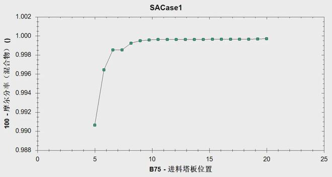对EDA合成与裂解工段的精馏塔的操作参数进行灵敏度分析。我们采用塔顶出口流股的醋酸乙烯酯的摩尔分率为目标变量,进料塔板位置作为操纵变量进行优化,当醋酸乙烯酯的摩尔分率保持稳定最大时,得到优化结果。