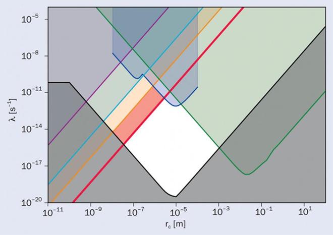 探测物理坍缩“质量正比”(mass proportional)物理塌缩模型的上限,其中波函数以塌缩率λ被局域在(关联)长度rc的范围。图中阴影区域为各类实验所排除的参数区间:冷原子干涉仪(cold-atom interferometry)(品红)、引力波探测器(绿色)、悬臂实验(蓝色)、整体(bulk)加热限制(青色),以及由桑福德地下研究设施(Sanford Underground Research Facility)马约拉纳验证装置(Majorana Demonstrator)合作组[注2]开展的自发 X 射线辐射搜寻(红色)。先前由自发X射线辐射得到的限制以橙色表示。理论下限用黑色实线标出。图片来源:Adapted from Majorana Collab. 2022 Phys. Rev. Lett. 129 080401