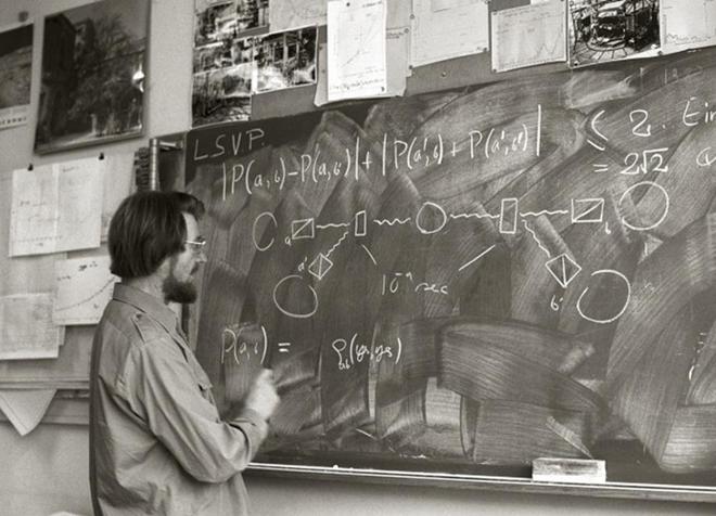 非局域性在1960年代和1970年代,约翰·贝尔重燃人们对量子力学基础的兴趣,为如今充满活力的量子信息领域奠定了基础。在图中的黑板上,纠缠的粒子从中央粒子源出现并传播到遥远的探测器。它们的类空分隔(spacelike separation)确保没有以低于或等于光速传播的信号在它们之间传递。贝尔定理表明,任何仅基于局域隐变量的理论都无法完全解释量子力学的预言并经实验证实的相关性。图片来源:CERN PhotoLabImage 82-6-270