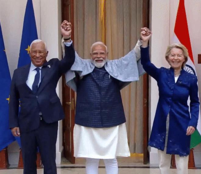 就在这一天,覆盖全球20亿人口、占据世界经济总量25%的两个庞然大物——印度与欧盟,在谈判桌上拉锯了整整20年后,突然按下了加速键。莫迪把它称为“所有协议之母”,而冯德莱恩则激动的称其为“史上最棒的交易”。