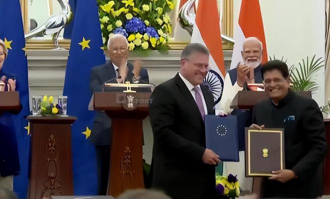 1月27日新德里那块巨大的电子屏上跳出最终的签字画面时,印度人猛地一喜,然后长出了一口气。台上莫迪总理的手紧紧握住了欧委会主席冯德莱恩的手,这一握,持续的时间比以往任何一次外交礼节都要长。