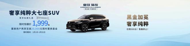 ·旗舰典范皇冠陆放:也特别推出黑金版尊享贴膜礼遇。价值8000元的原厂高品质隔热膜,限时专属秒杀价仅1999元,限量前500名订车用户,先到先得。同时,在1月1日到1月31日期间置换的用户,额外再享至高2万元限时置换基金。